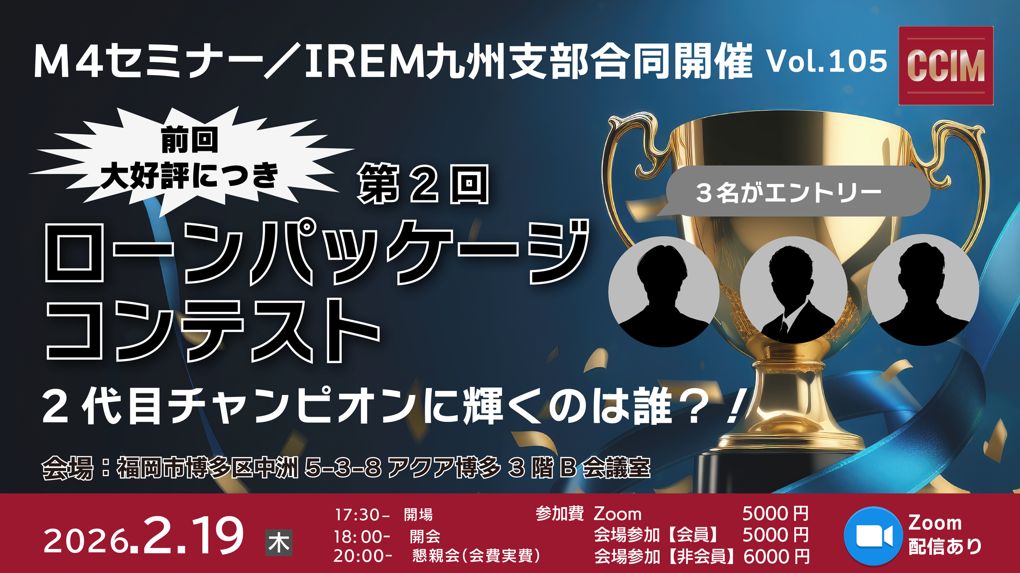 収益物件などの融資を申し込む際に金融機関に提出するプレゼン書類、「ローンパッケージ」。これをコンテスト形式で審査し、2代目ローンパッケージチャンピオンを決定します。優勝者には賞金があり、審査員には金融機関の方に来ていただきます。