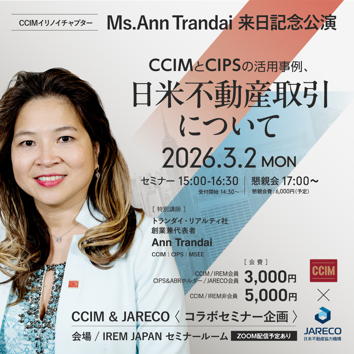 | 会 費: | IREM・CCIM会員/CIPS&ABRホルダー/JARECO会員 会場参加・ZOOM参加ともに:3,000円 IREM・CCIM非会員 会場参加・ZOOM参加ともに:5,000円 |